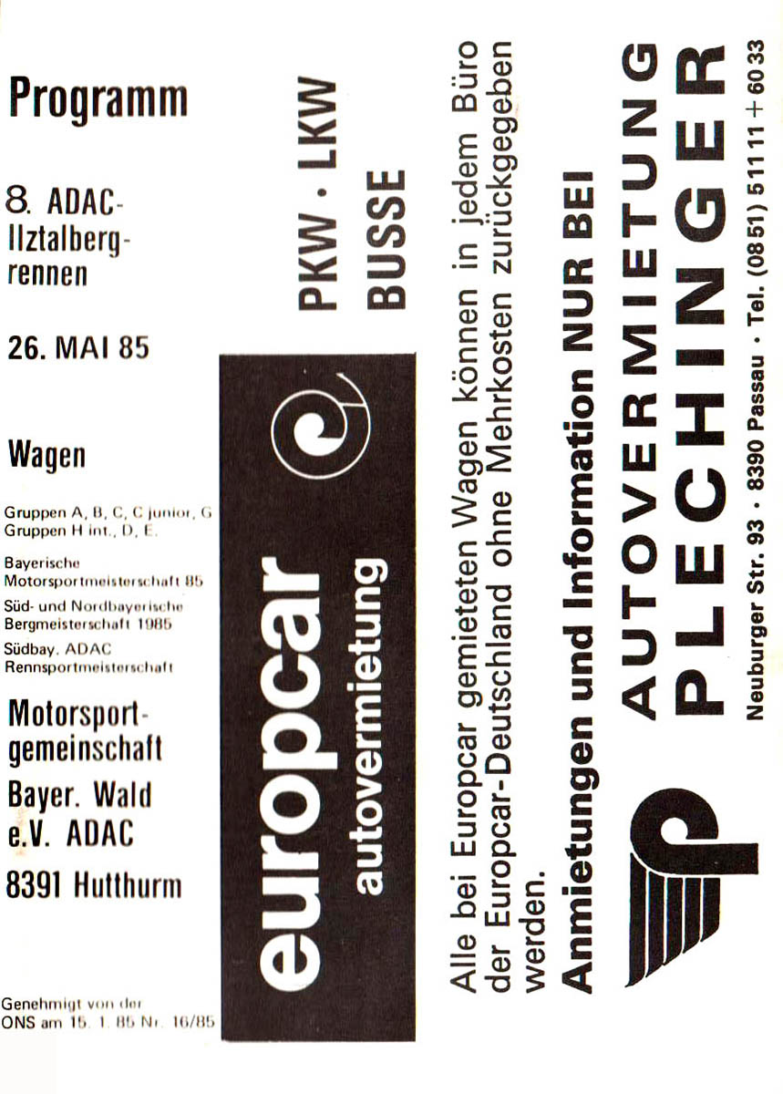 26.05.1985 - Ilztal Streckenskizze Programmheft Starterliste Alle Ergebnisse: Nennungsliste Ergebnis Rennen