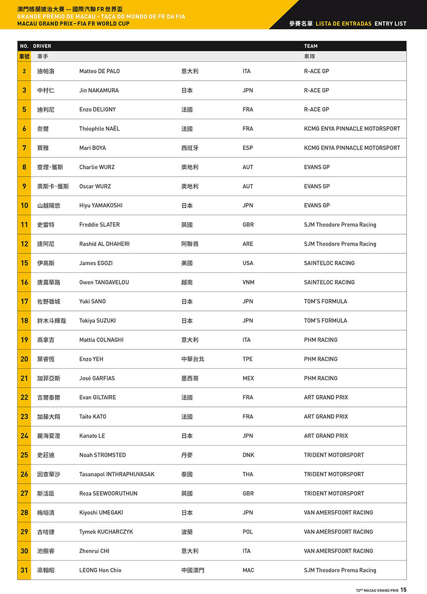 16.11.2025 - Macau FIA Formula Regional World Cup Streckenskizze Programmheft Starterliste Alle Ergebnisse: Vorbericht Nennungsliste Qualifikationsrennen Ergebnis freies Training 1 Bericht freies Training 1 Ergebnis Zeittraining 1 Original Zeitnahme Bericht Zeittraining 1 Ergebnis freies Training 2 Bericht freies Training 2 Ergebnis Zeittraining 2 Original Zeitnahme Bericht Zeittraining 2 Gesamtergebnis Zeittraining 1+2 Original Zeitnahme Startaufstellung Qualifikationsrennen Ergebnis Qualifikationsrennen Original Zeitnahme Rundentabelle Qualifikationsrennen Bericht Qualifikationsrennen Nennungsliste Finalrennen Startaufstellung Finalrennen Ergebnis Finalrennen Original Zeitnahme Rundentabelle Finalrennen Bericht Finalrennen