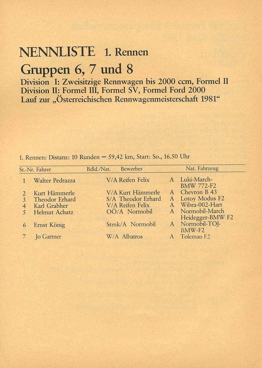 19.04.1981 - Zeltweg (1.Lauf Österreichische Rennwagen Meisterschaft) Streckenskizze Programmheft Starterliste Alle Ergebnisse: keine Formel 3 am Start
